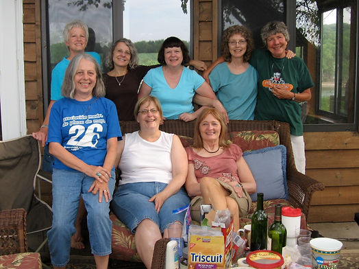 Below: Pam in the upper left, with writer buddies
